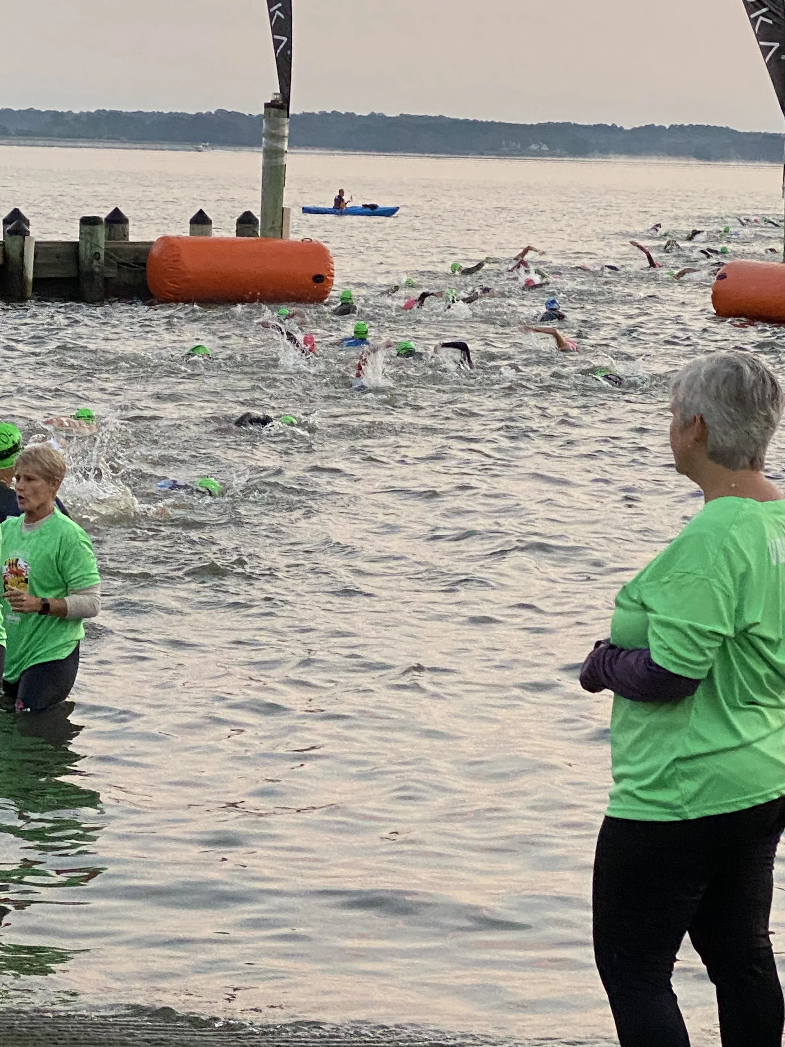 I seeded myself towards the front of the 1:10 – 1:20 wave. It was not your typical swim roll start where groups of 5 swimmers are sent off between with 5 seconds between groups. Instead, we were lined up in 2 lines and marched heel to toe into the water from the boat ramp and started our swim as soon as we crossed the timing mat.