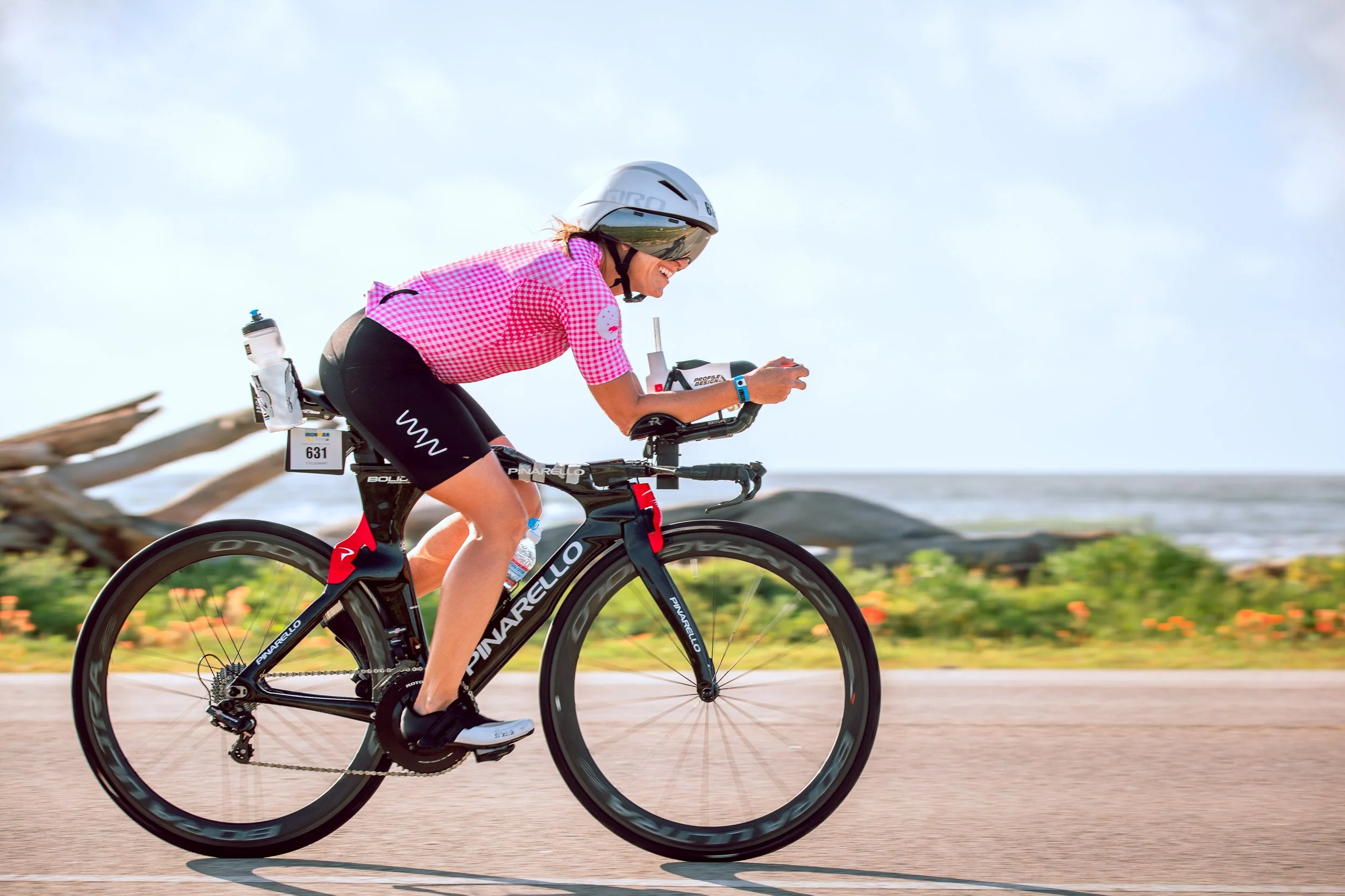 My swim goal for Galveston was to swim strong, calm, and remain present. My swim effort felt good and I am happy with my swim time. I seeding myself in my correct swim wave allowing me to swim with similar paced swimmers and never be passed. This helps with finding your rhythm and also confidence booster. I also love swim starts where you get to jump from a pier versus having to run into the swim. As soon as I jumped into the Galveston Bay, my race mode clicked and I went straight for the inside fight for buoy placement. I was swimming so straight that I actually hit the first buoy with my head and I did this 2 more times, finding myself having to swim under the buoy.