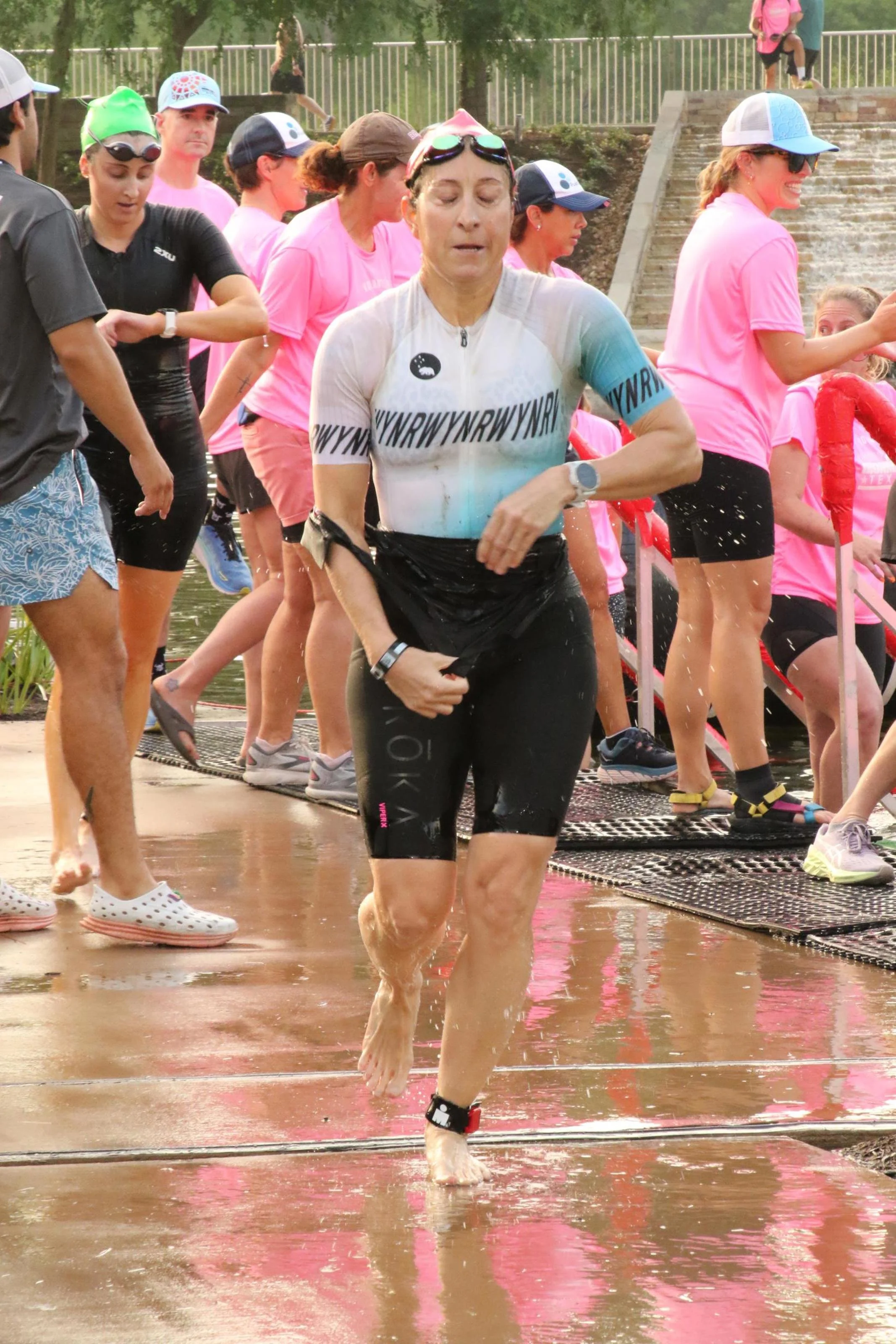 The rest of the swim was how I was expecting it to go. I find Texas swim course a bit of a challenge to navigate. You start the race at Northshore Park swimming in Lake Woodlands and finish at Town Green Park in a man-made canal. I mentally divide the swim into 3 sections. Section 1: The Lake. You swim in a long rectangle, out and back, about 2800 meters total. You swim the first straight away of the rectangle before sunrise, since the swim starts at 6:30am. I knew visibility would be a bit of a challenge because I had chosen tinted goggles, but they would come in handy with the sunrise. Section 2: Canal Entrance. This section is tricky as you swim towards the sun, all while navigating for the straightest line into the canal. It feels like every swimmer goes in different directions in this section until we all collide in the narrow man-made canal. Section 3: The Mosh Pit. You swim about 1000 meters in a narrow canal with high retaining cement walls. Water splashing on the walls has nowhere else to go, but back at the swimmers. It’s a total washing machine effect and we are all fighting for the middle of the canal while listening to spectators with cow bells right on top of you.